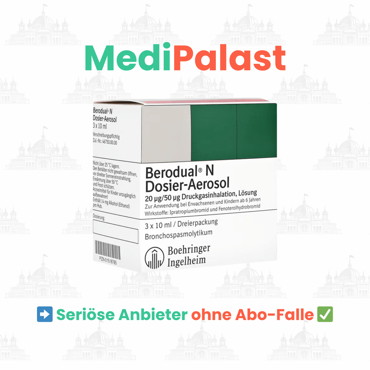 Ohne gültiges Rezept ist es nicht möglich, legal Berodual kaufen zu können. Von illegalen Fake-Shops, die dir im Netz Berodual rezeptfrei anbieten, möchten wir dir dringend abraten. Du riskierst damit Gesundheit und rechtliche Konsequenzen. Zudem drohen dir finanzielle Risiken und deine Daten werden meist verkauft und missbraucht.