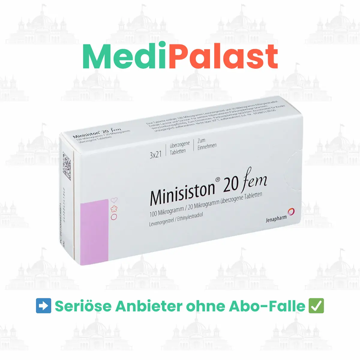 Ohne gültiges Rezept ist es nicht möglich, die Minisiston 20 fem legal zu beziehen. Von illegalen Fake-Shops, die das Produkt rezeptfrei versprechen, raten wir dringend ab. Es drohen Gesundheitsrisiken durch Fälschungen sowie der Missbrauch privater Daten.